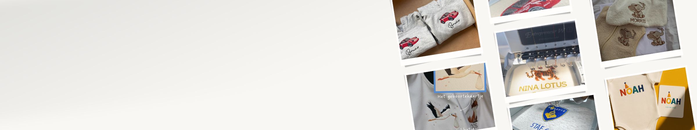 Een praktisch item verandert zo in een blijvende herinnering. Een romper met een detail uit het geboortekaartje, een slabbetje met een persoonlijke illustratie voor in de herinneringsbox of een trui met een symbool dat staat voor een bijzondere periode. Elk item wordt speciaal op bestelling gemaakt en professioneel geborduurd met onze moderne borduurmachines in ons atelier.